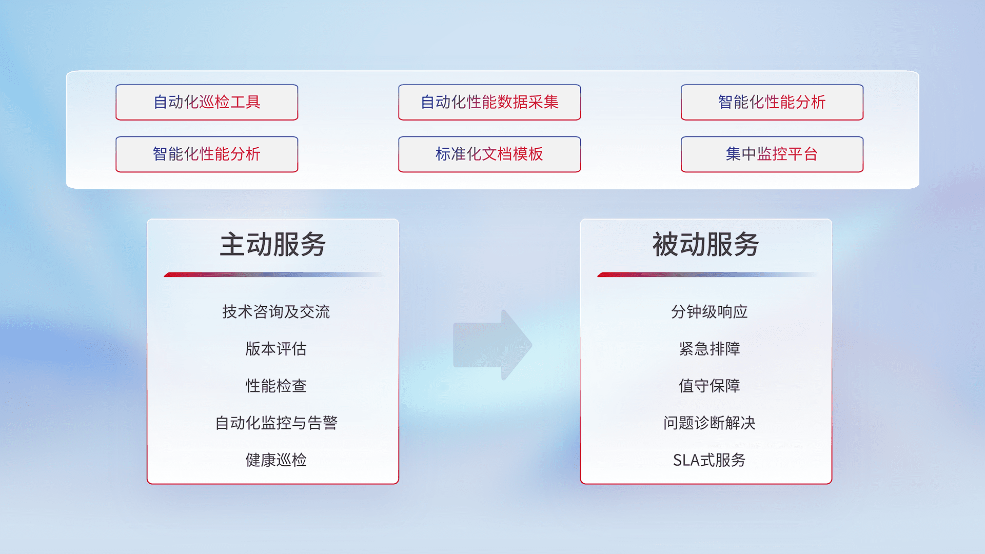 智能化工具和标准化文档,,,,保障服务质量,,提供主动服务(包含技术咨询、、、、版本评估、、、、性能检查、、、自动化监控与告警、、健康巡检)和被动服务包含(分钟级响应、、、紧急排障、、、值守保障、、、问题诊断解决、、SLA服务)。。。